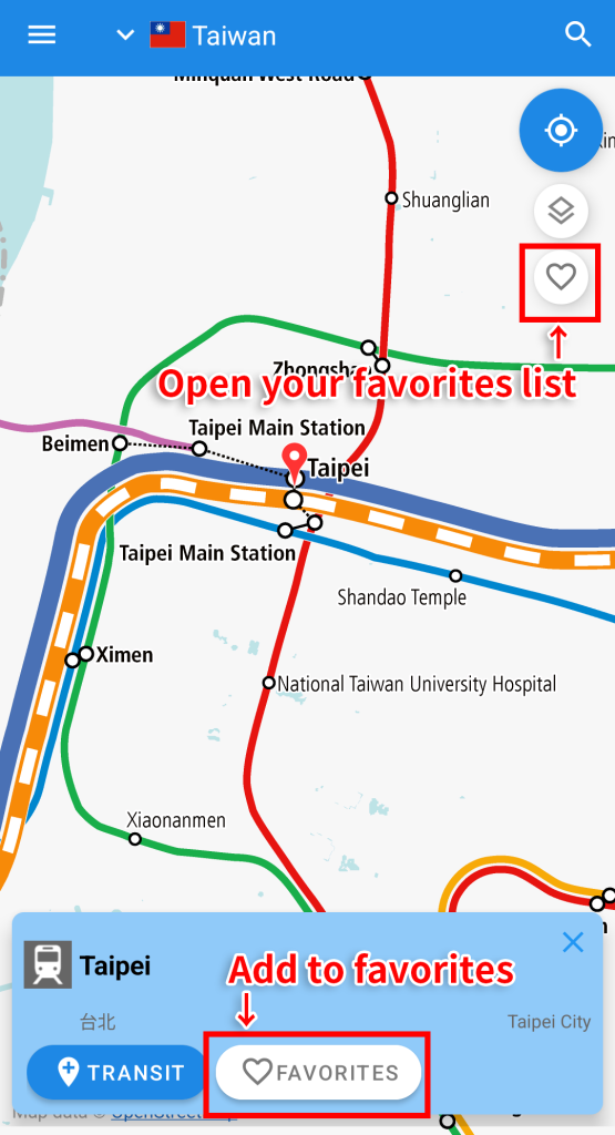 要访问收藏夹列表,请点击路线图屏幕右上角的心形按钮。从列表中选择一个位置,即可立即显示以该位置为中心的路线图,无需在地图上滚动太久。