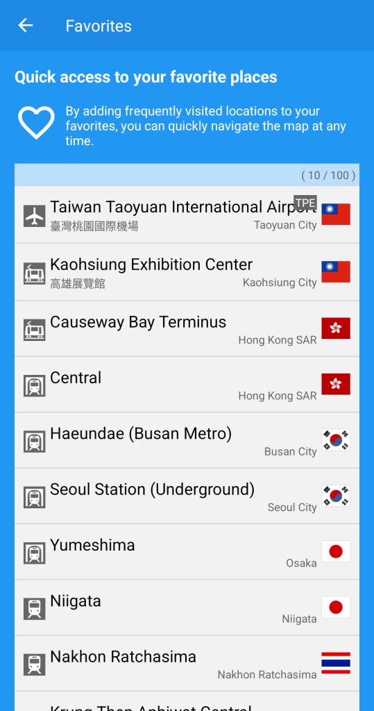 这项新功能旨在回应用户的反馈,他们希望查看不同地区的路线图,但又觉得滚动地图很麻烦。收藏非常简单。只需点击路线图上的某个车站,然后按下出现的车站卡片上的“收藏夹”按钮即可。您最多可以将 100 个车站和机场保存到您的设备,包括距离您家、工作场所、商务或旅行目的地最近的车站和机场。